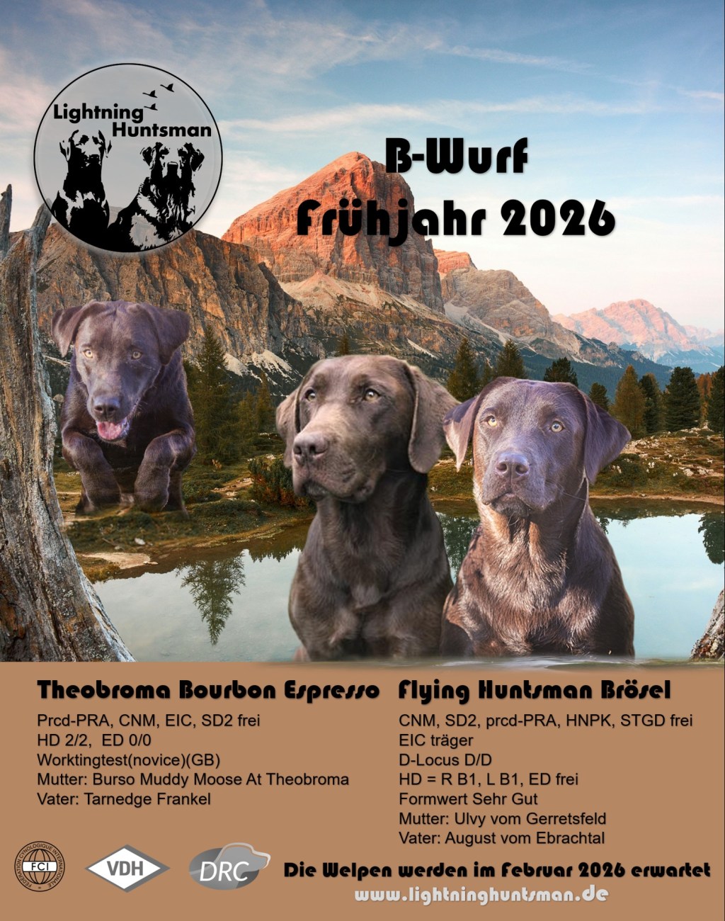 Brösel ist am 24. Dezember gedeckt worden. Als Deckrüden haben wir uns für Theobroma Bourbon Espresso entschieden – einen beeindruckenden, rein braunen Rüden, der in England lebt und dort sehr erfolgreich auf Working Tests geführt wird. Seine Arbeitsfreude, Führigkeit und seine ausgeprägten Anlagen machen ihn zu einem hervorragenden Vertreter der Arbeitslinie.